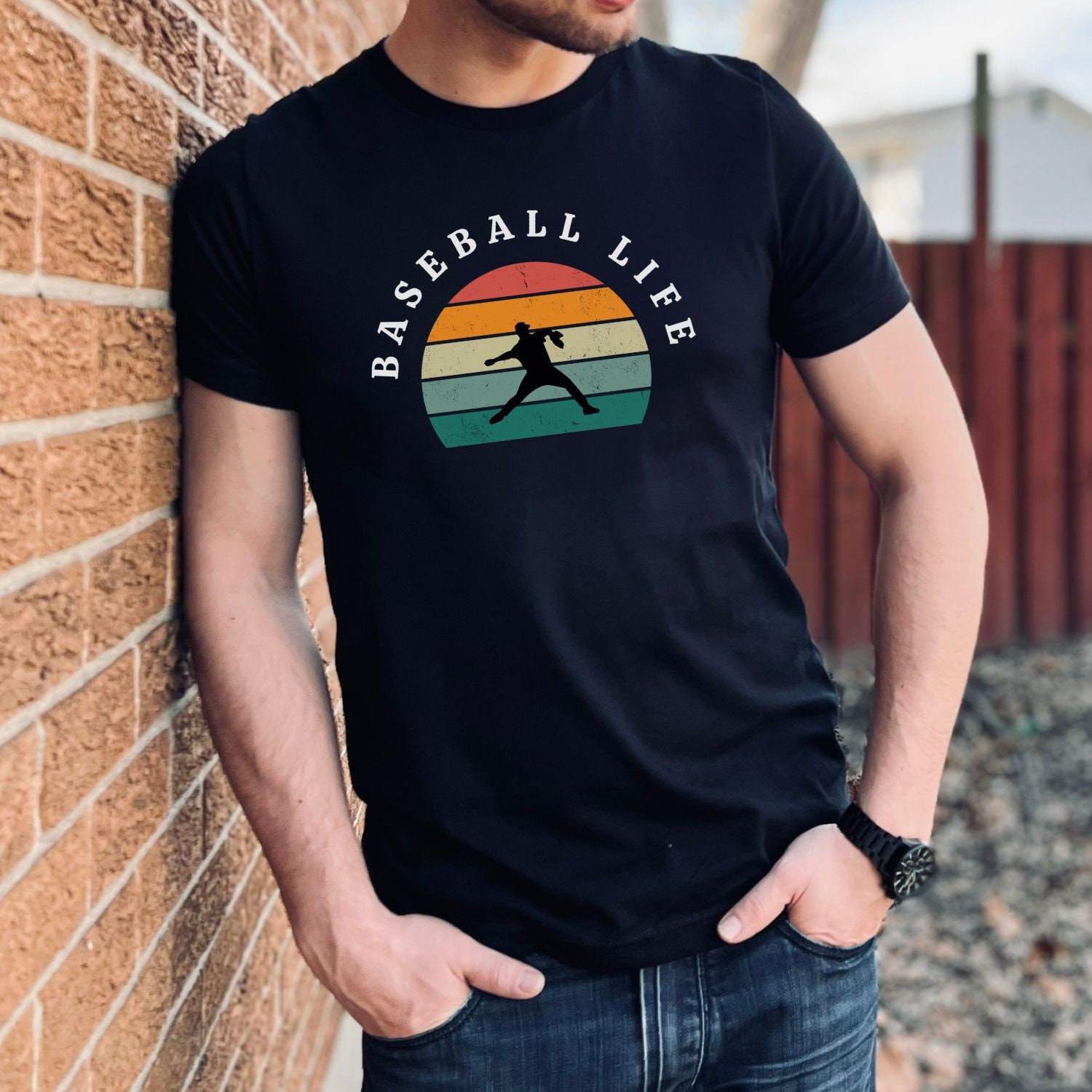 Show your love for baseball with this baseball life shirt! Great for baseball players, baseball moms dads, and and grandparents The vintage sunrise graphic looks great and you can choose the pitcher or batter style graphic.