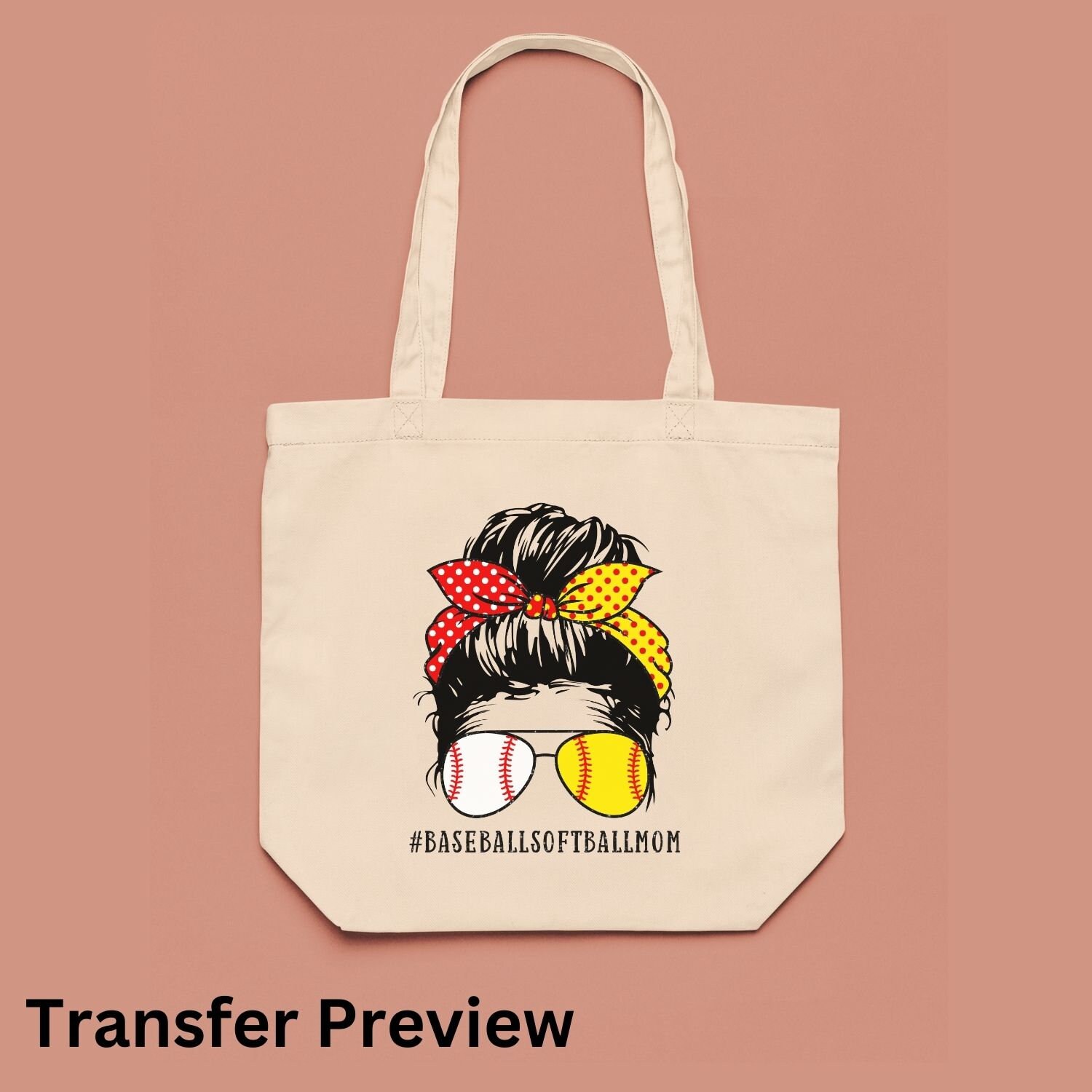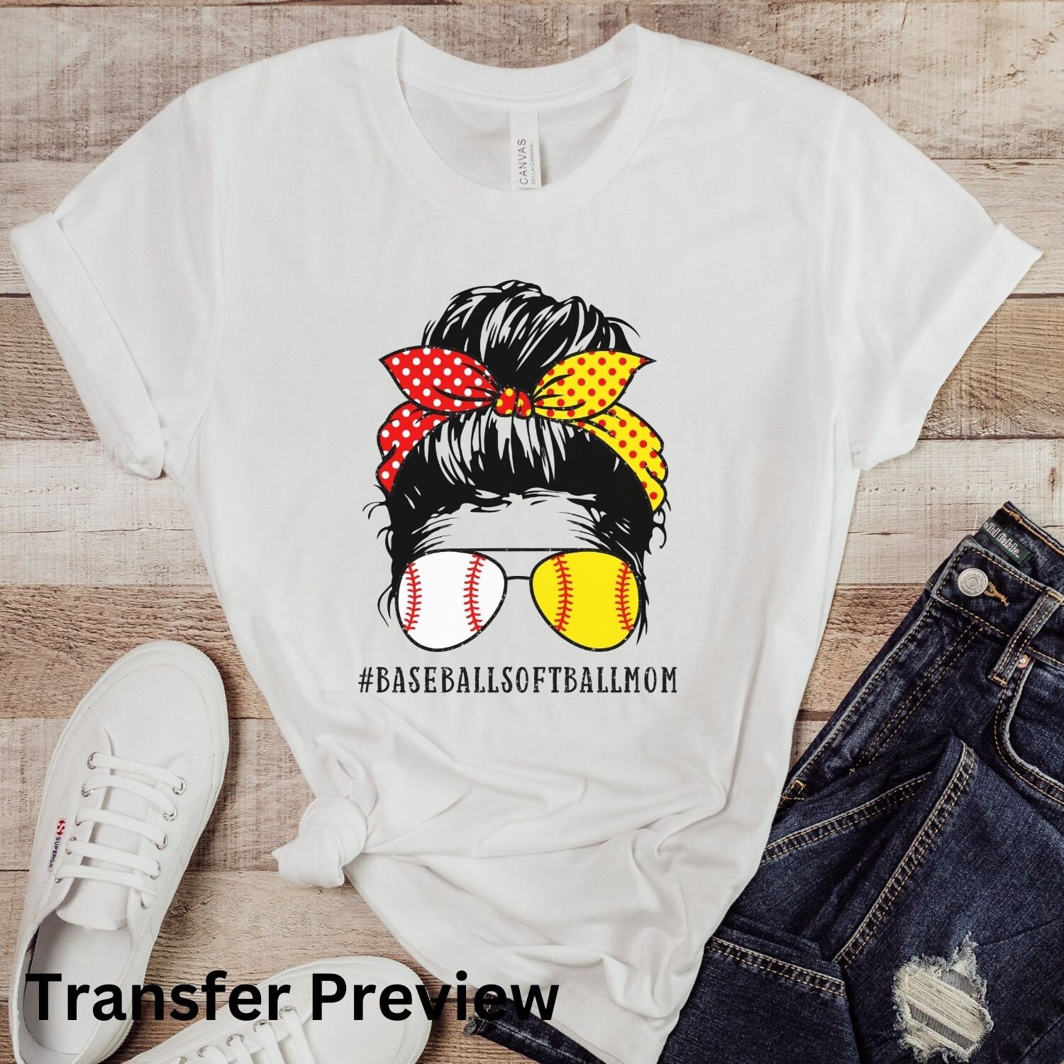 Baseball Softball Mom Transfer, Messy Bun Baseball And Softball Transfer, Ready To Press DTF Transfer, Heat Press Transfer, No Weeding Easy To Apply, T-Shirt Transfers