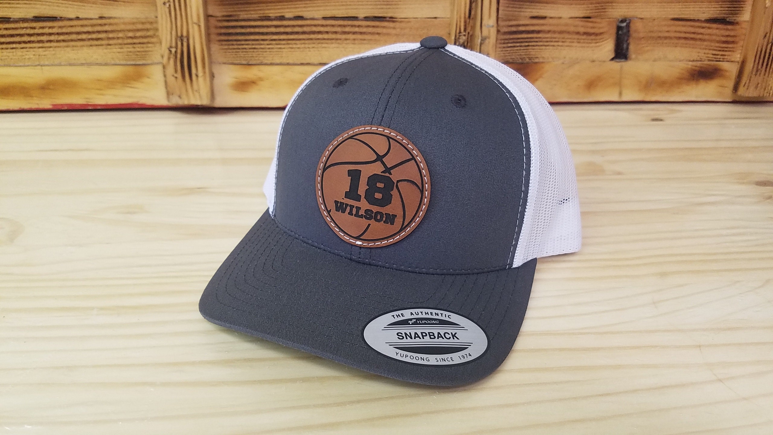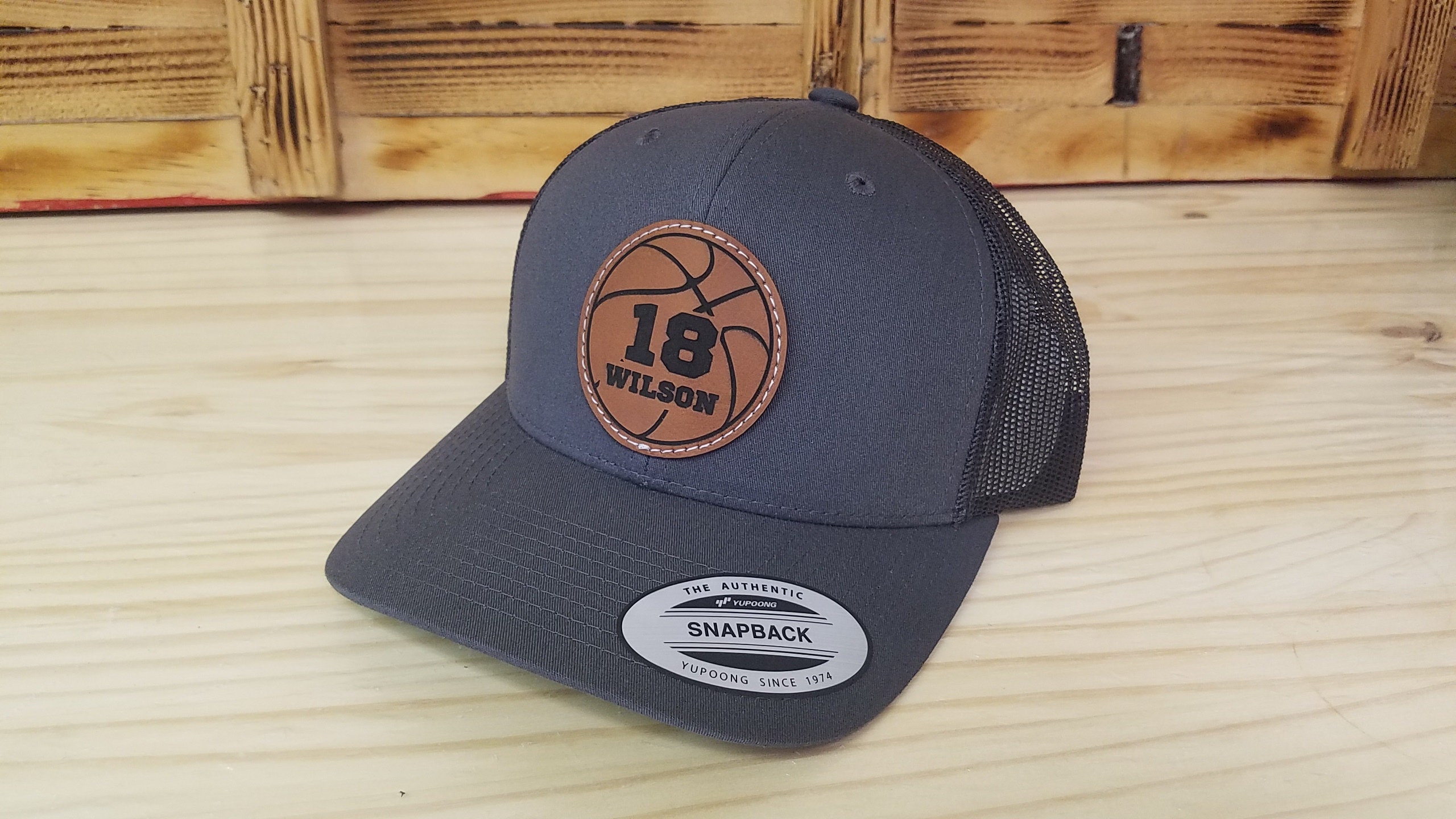 Support your son, daughter, grand daughter, grandson, or favorite college / pro player on their basketball team with this laser engraved player number leather patch hat! The patch has a sewn edge with the the player number and last name custom etched on it.