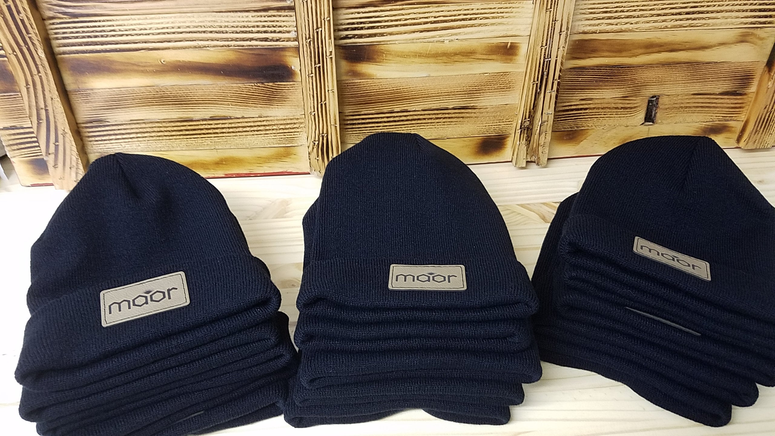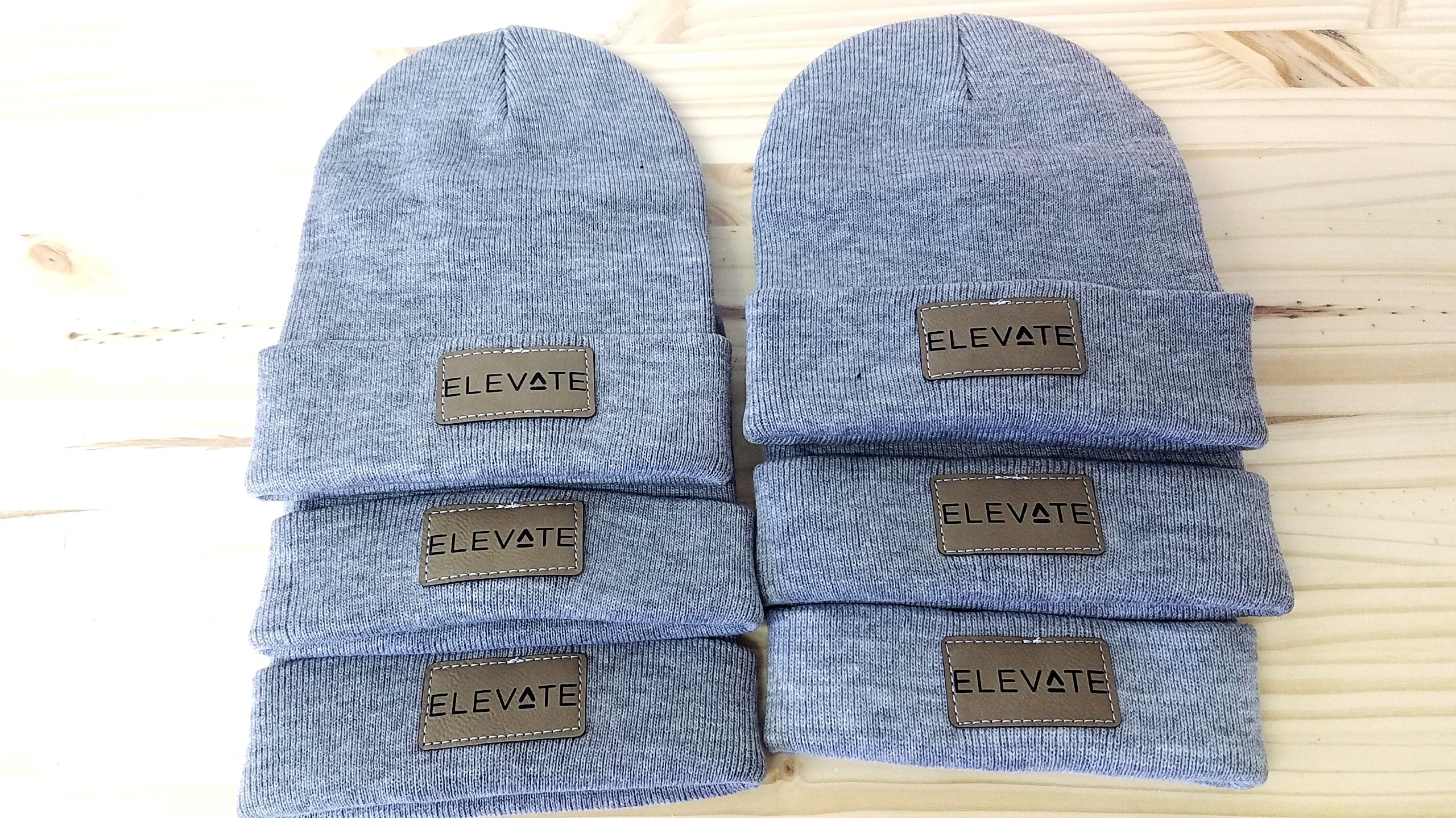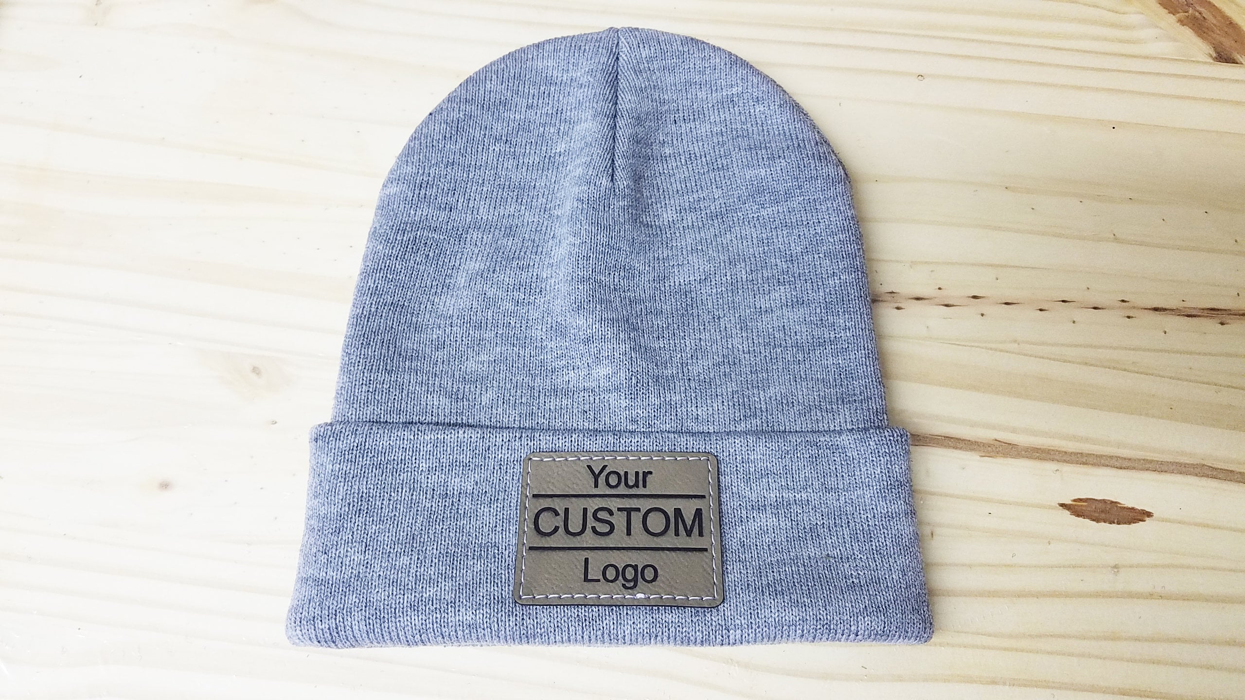 Custom laser engraved and sewn leather patch beanies with your name or logo. Patches are custom laser engraved with a sewn edge for a finished look. Great for personalized gifts and company swag!