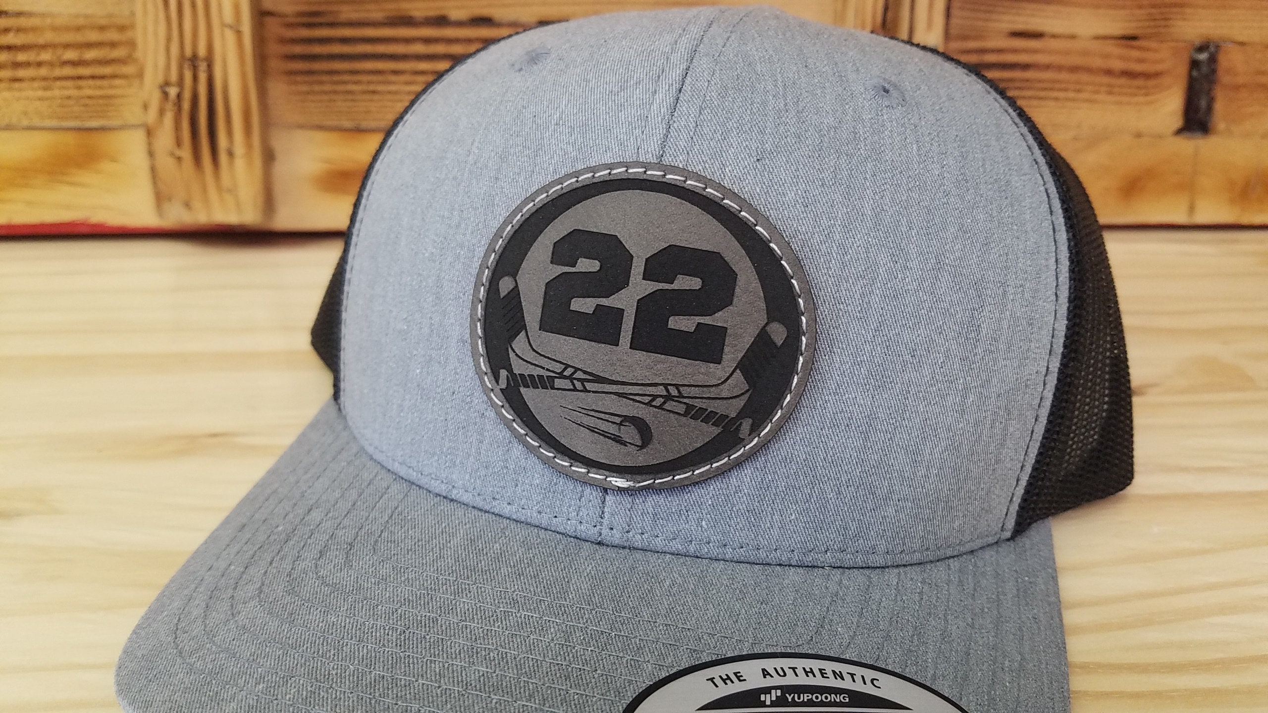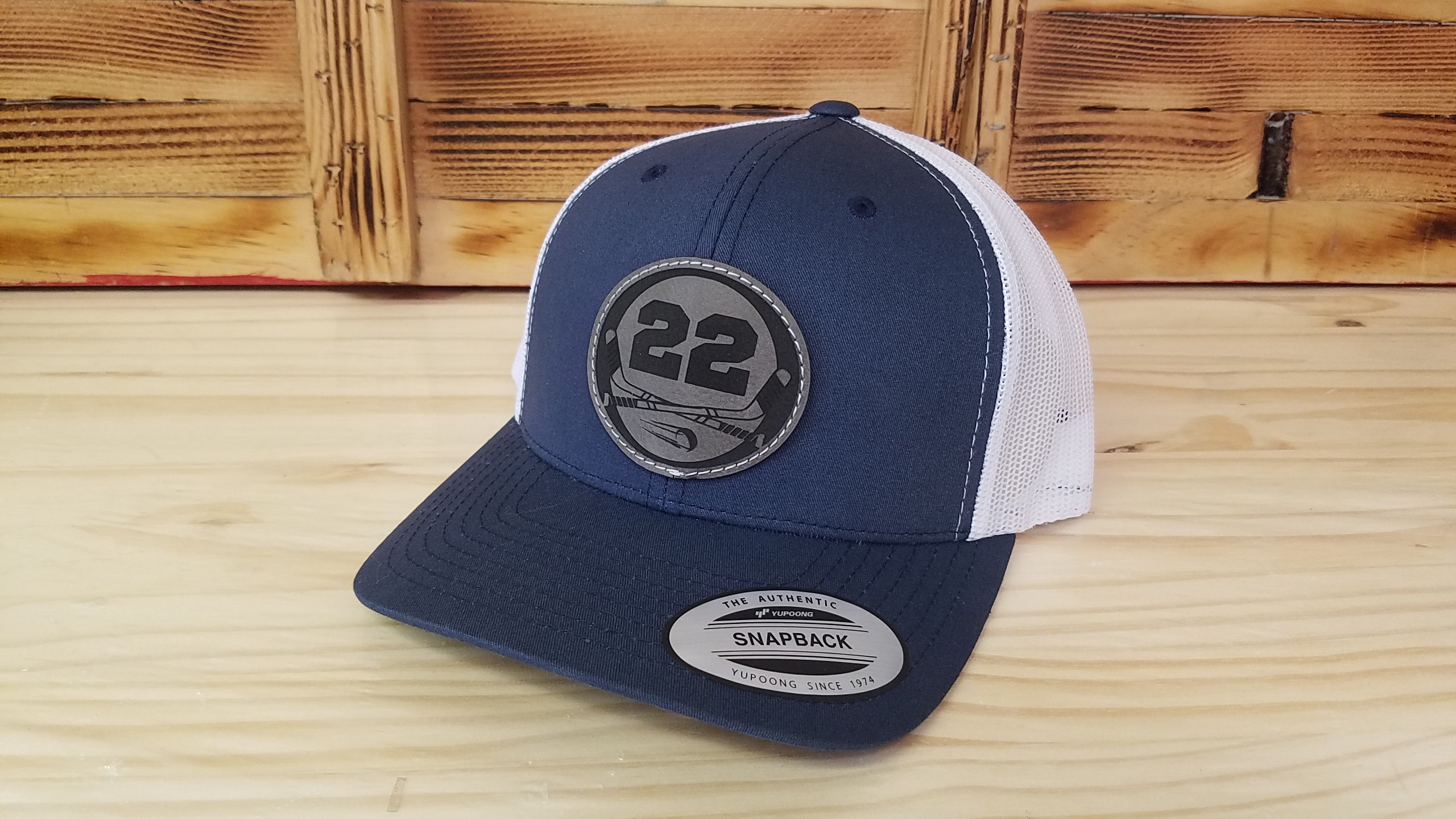 Hockey Personalized Player Number Leather Patch Hat | Personalized Hockey Hat | Trucker Style Snapback Closure