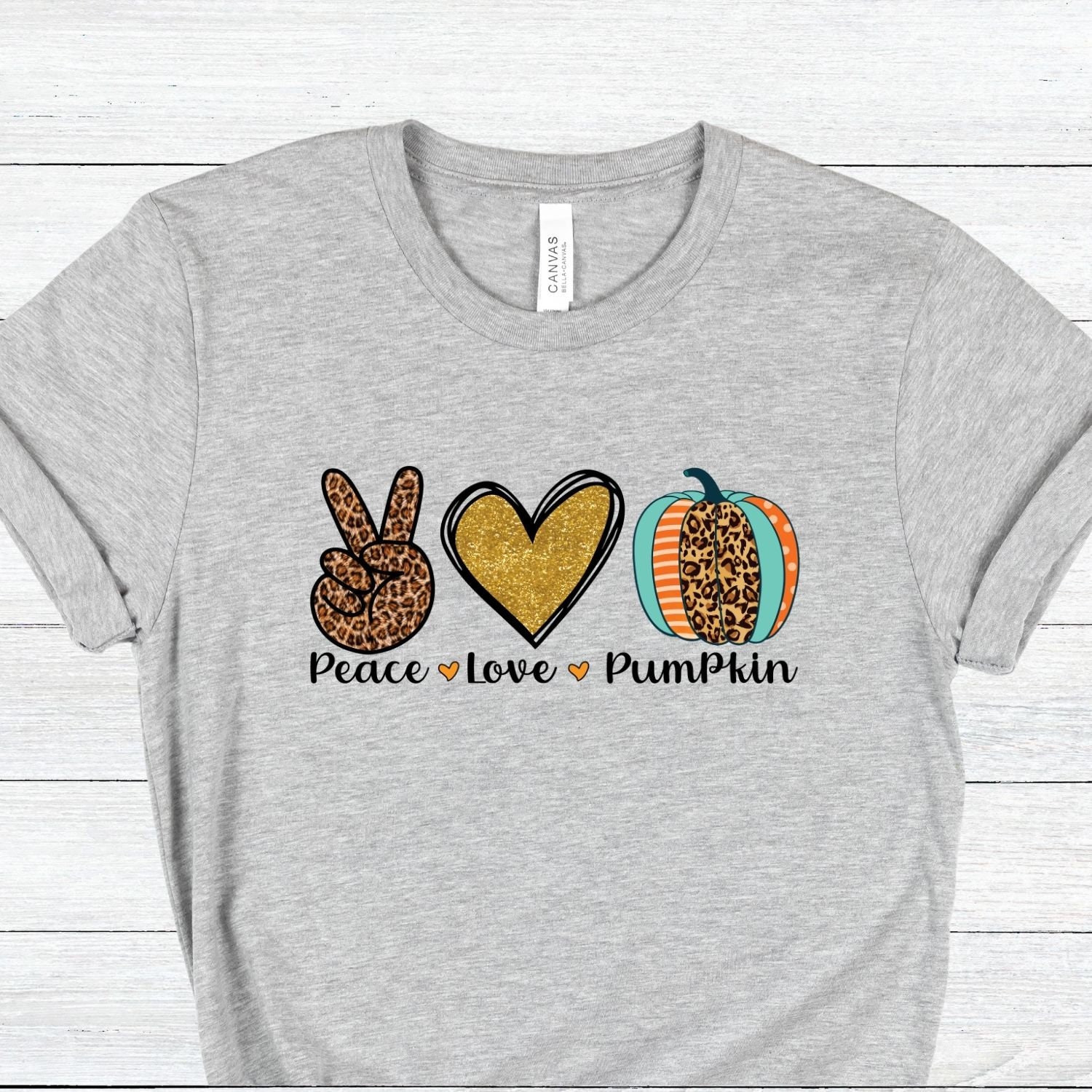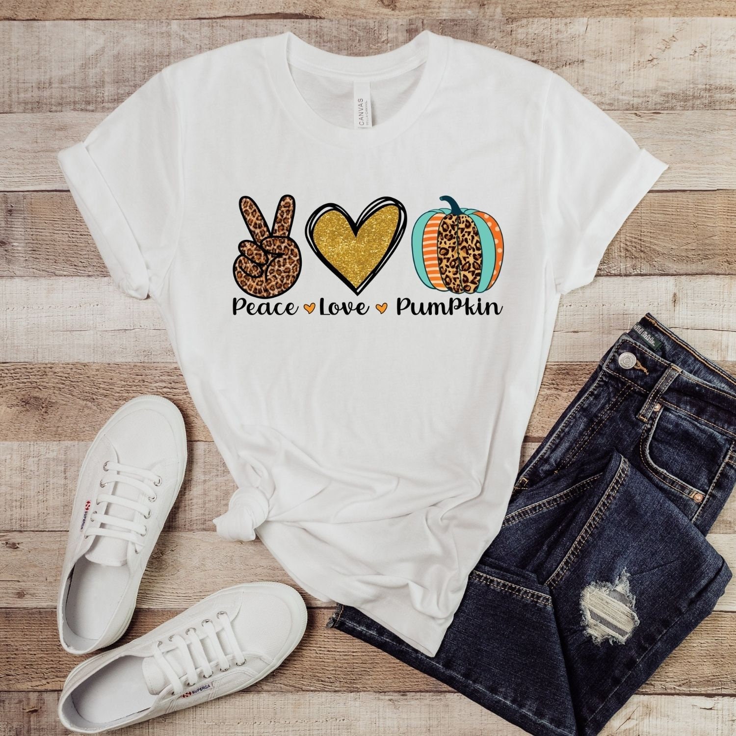 This Peace Love Pumkin Thanksgiving graphic is printed on Bella+Canvas Tees and Gildan 18000 crewneck sweatshirts. We use the best quality designs and printing techniques to give you a product you will absolutely love. We print with commercial DTG equipment and only use Oeko-Tex Eco Passport Certified Ink. Please see sizing images on the listing for size and measurements.