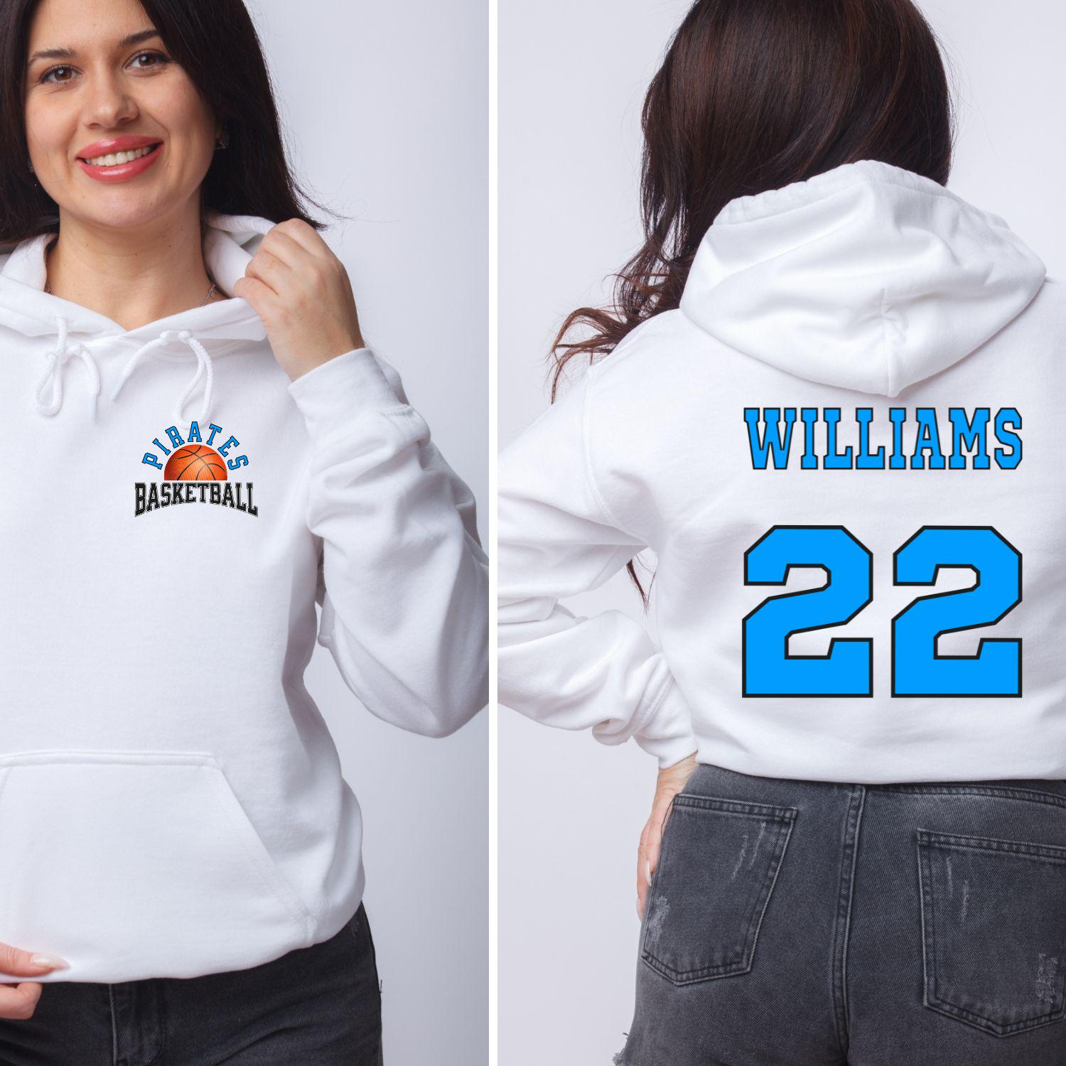 This personalized basketball graphic with team name and player name and number printed on t-shirts, crewneck sweatshirts, or hoodies.