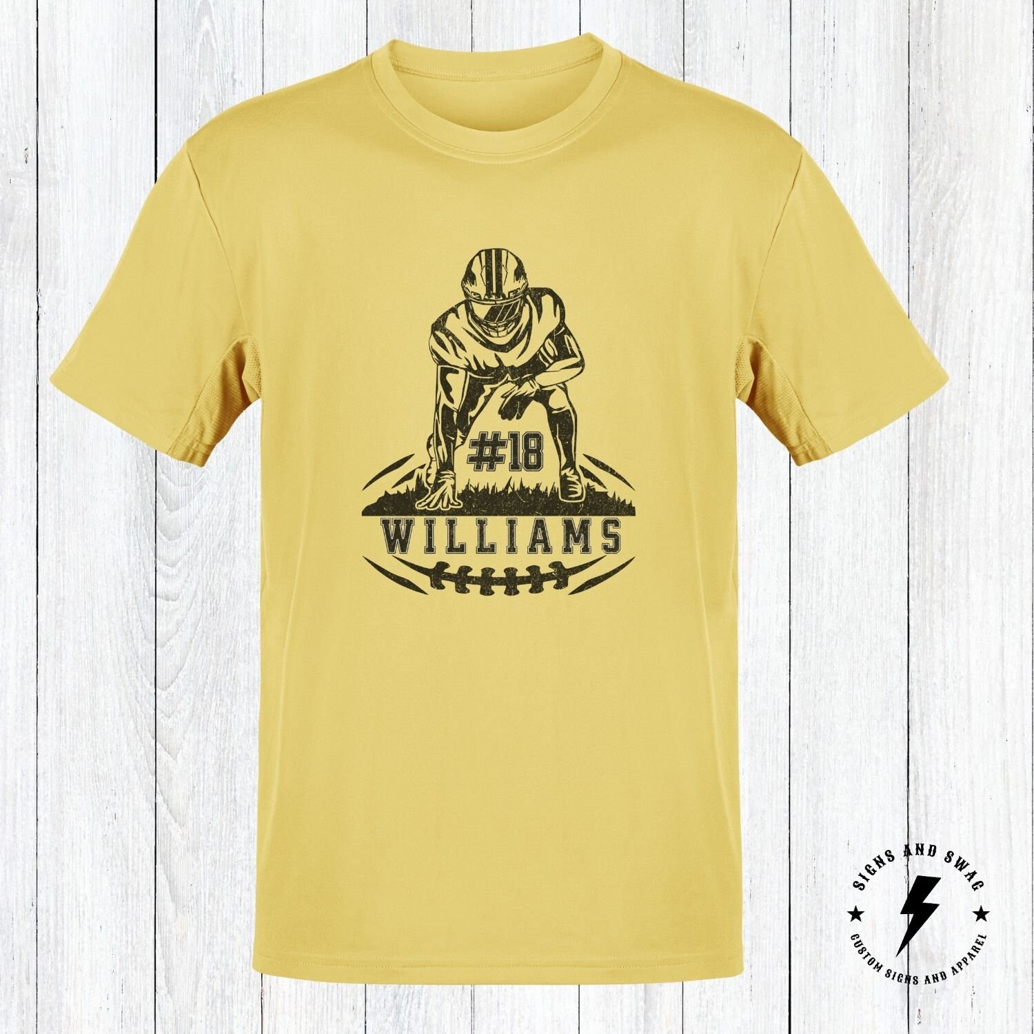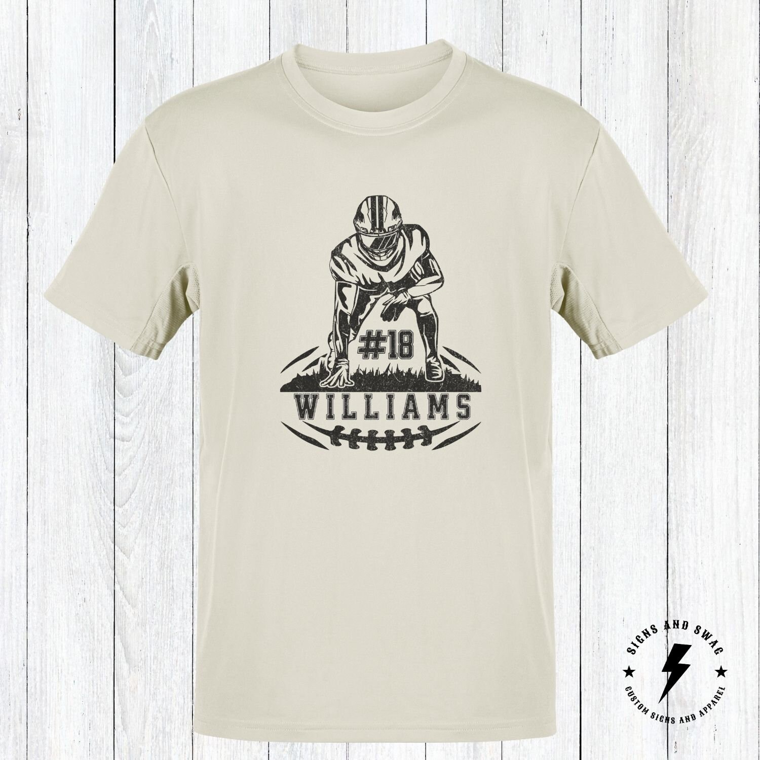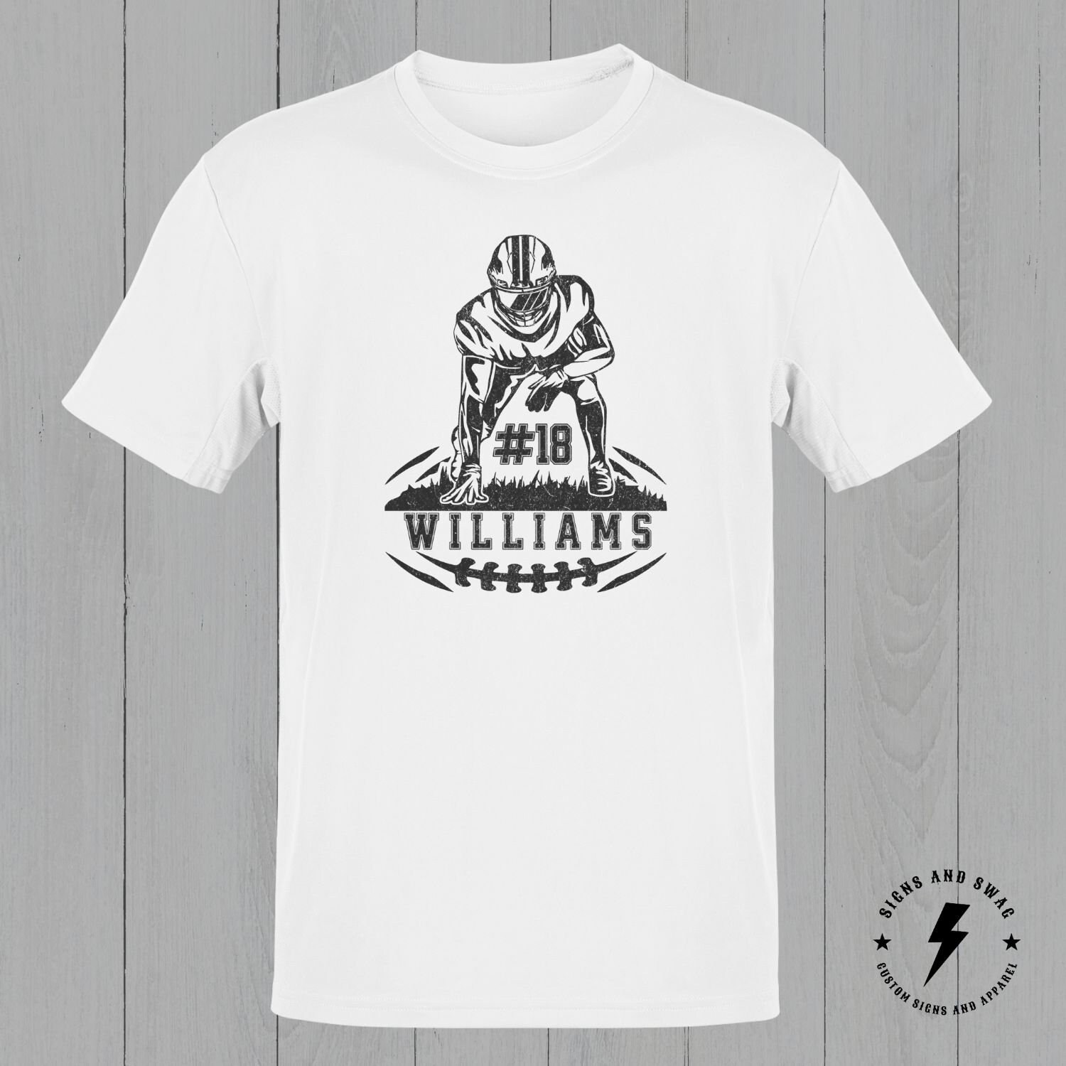 This personalized football player name and number graphic with your custom player name and number printed on cotton Tees, crewneck sweatshirts, or hoodies. We use the best quality designs and printing techniques to give you a product you will absolutely love. We print with commercial DTG equipment and only use Oeko-Tex Eco Passport Certified Ink. Please see sizing images on the listing for size and measurements.