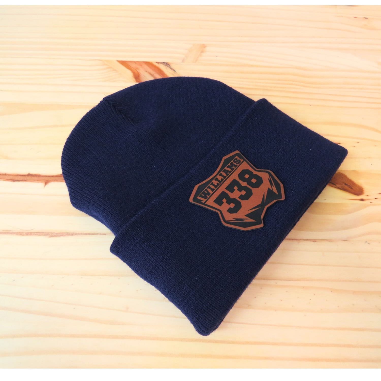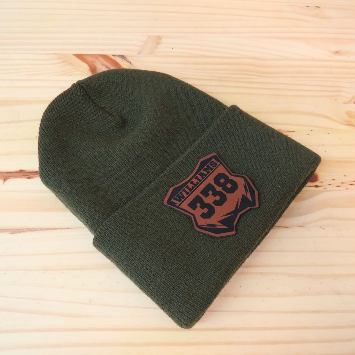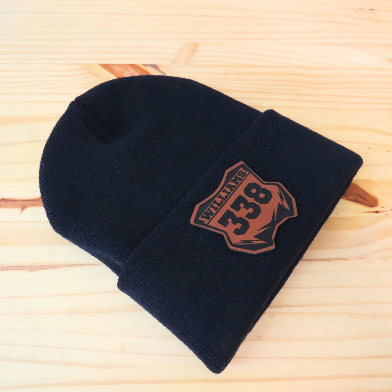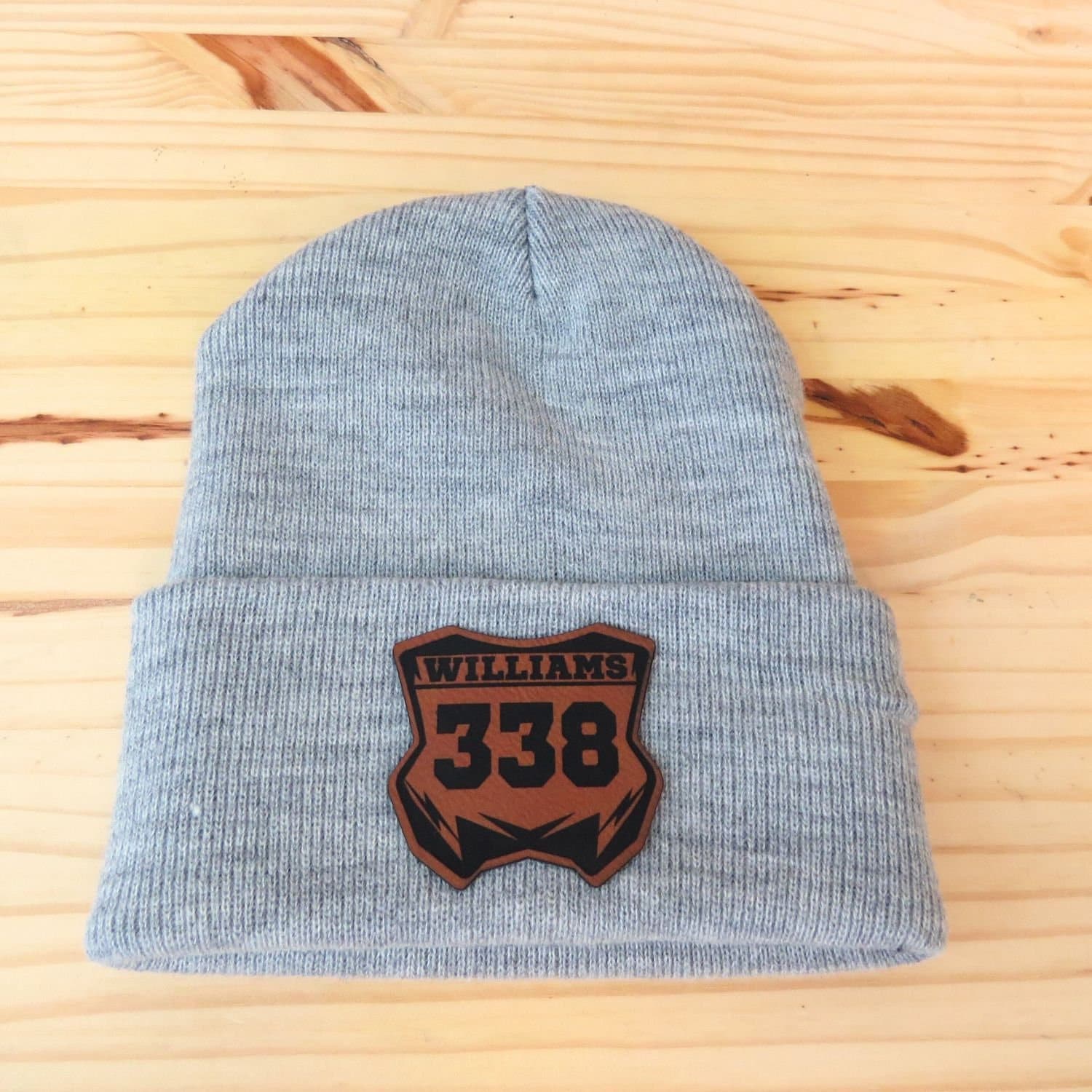 Personalized motocross number plate beanie with customizable plate number and name. These custom laser etched patches look great on these beanies and are available in several colors.