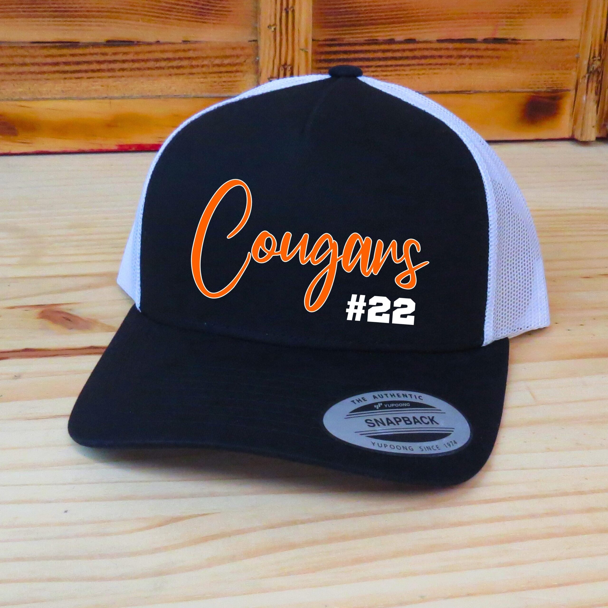 Gameday Hat, Trucker Snapback, Printed Graphic. Your hat can be customized with team name and optional player number, with your team’s primary color. These hats are printed in full color, these are NOT embroidered.