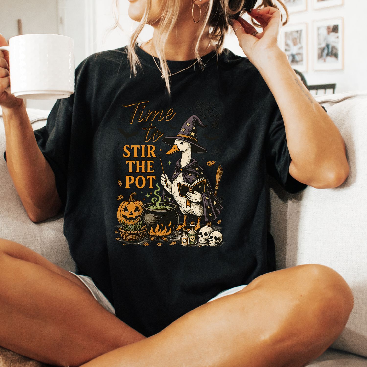 Trouble’s brewing… and this goose is at the center of it. Introducing the “Time to Stir the Pot” Halloween tee — a spooky-season staple for the sarcastic, sassy, and slightly chaotic.