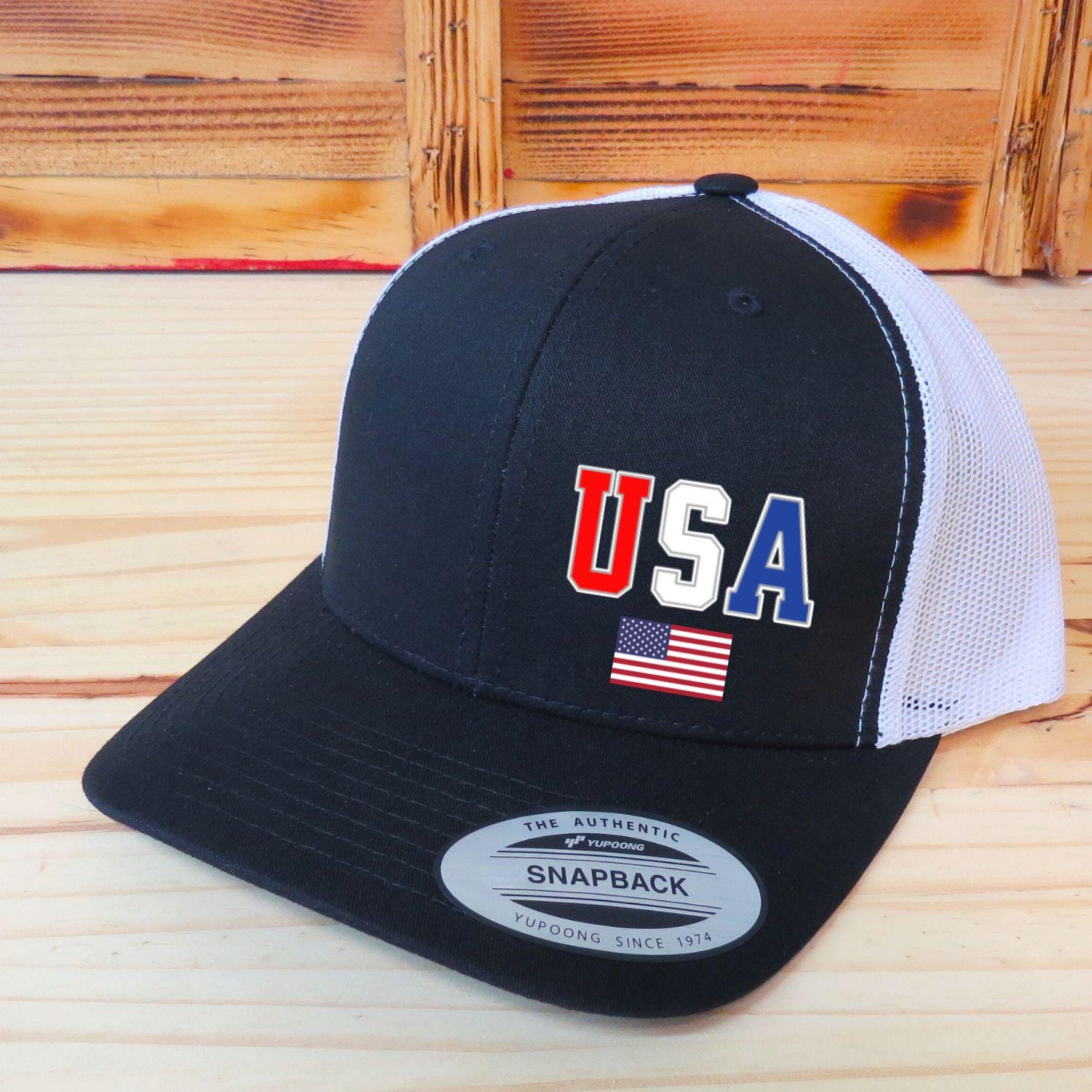 Show your love for the USA with this red, white, and blue USA graphic with the American flag! The hats are the popular trucker style snapback that look great and are available in several colors – see available colors. This USA American Flag graphic is printed on each hat with our high quality commercial equipment, these are NOT embroidered.